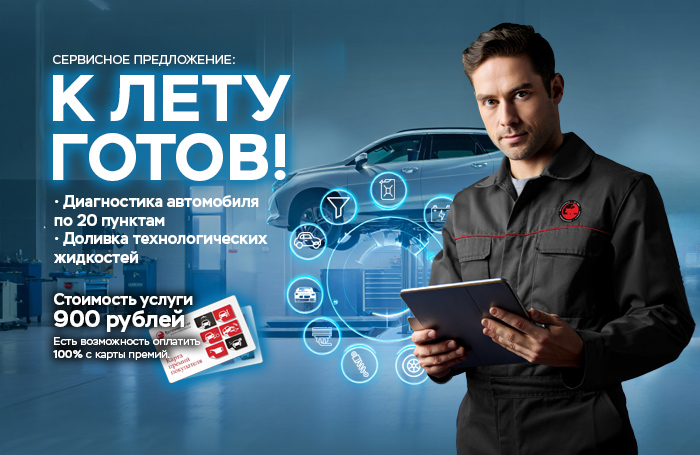 В период акции с 20 апреля по 30 июня 2026 года наш сервисный центр осуществит проверку вашего автомобиля по 20 пунктам на предмет готовности к летнему сезону, а также выполнит диагностику, регулировку (в случае необходимости) и доливку технологических жидкостей: